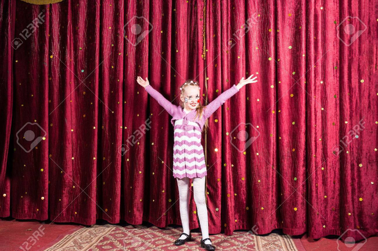 Nina Bastante Orgullosos De Pie En El Escenario Durante Una Representacion De Una Obra De Teatro O Pantomima Con Los Brazos Extendidos En Frente De Las Cortinas De Color Burdeos Cerrados Fotos
