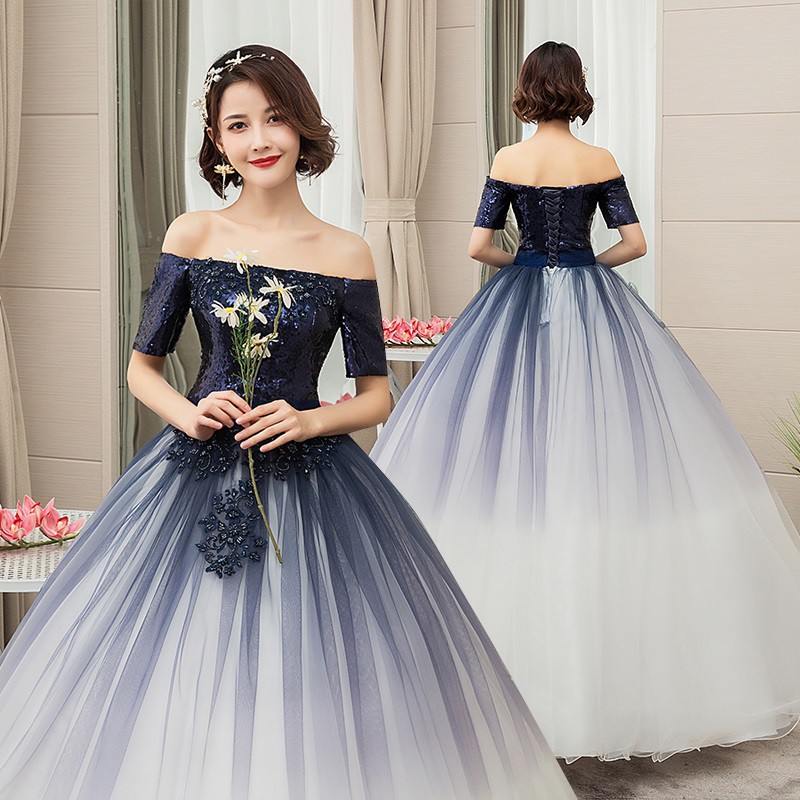 S 3xl Off Shoulder Navy Blue Shinning Puffy Party Dinner Engagement Costume Ballroom Dress Gown 8 Shopee Malaysia