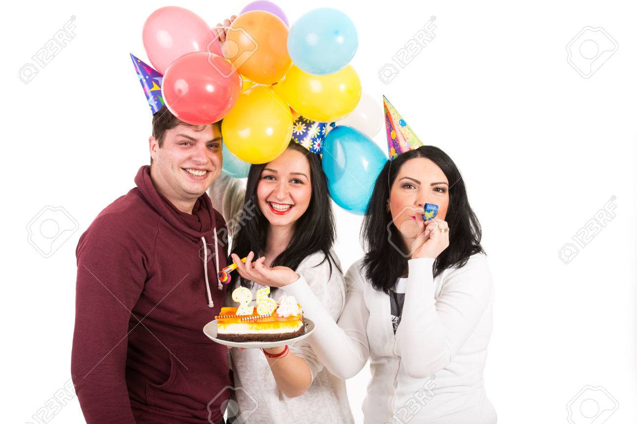 Happy Drie Vrienden In Vrouw Verjaardag Met Taart En Ballonnen Blazen Hoorn Partij Geïsoleerd Op Wit Royalty-Vrije Foto, Plaatjes, Beelden En Stock Fotografie. Image 26931541.